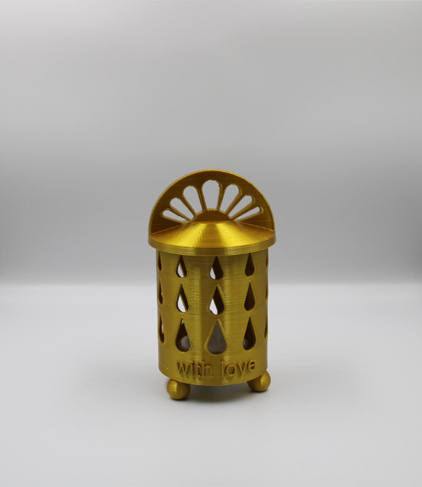 LED Deko-Laterne „Tropfen gold“ im 3D-Druckverfahren gefertigt und aus umweltfreundlichem, biologisch abbaubarem PLA hergestellt. Die LED Kerze verfügt über einen Timer und schaltet sich nach 6 Std. automatisch aus. Am nächsten Tag schaltet sie sich wie am Vortag zur gleichen Zeit wieder ein.