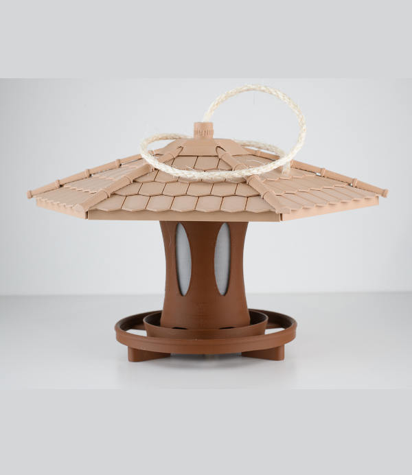 Vogelfutterhaus für Streufutter im 3D-Druckverfahren gefertigt und aus biobasiertem Kunststoff PLA (Polyactide) welcher aus erneuerbaren Ressourcen wie Maisstärke oder Zuckerrohr hergestellt.