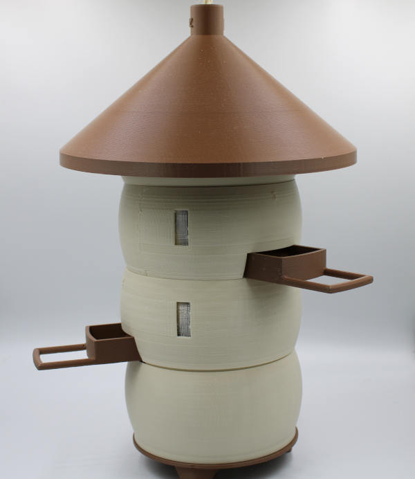 Vogelfutterhaus Torre für Streufutter im 3D-Druckverfahren gefertigt und aus biobasiertem Kunststoff PLA (Polyactide) welcher aus erneuerbaren Ressourcen wie Maisstärke oder Zuckerrohr hergestellt.